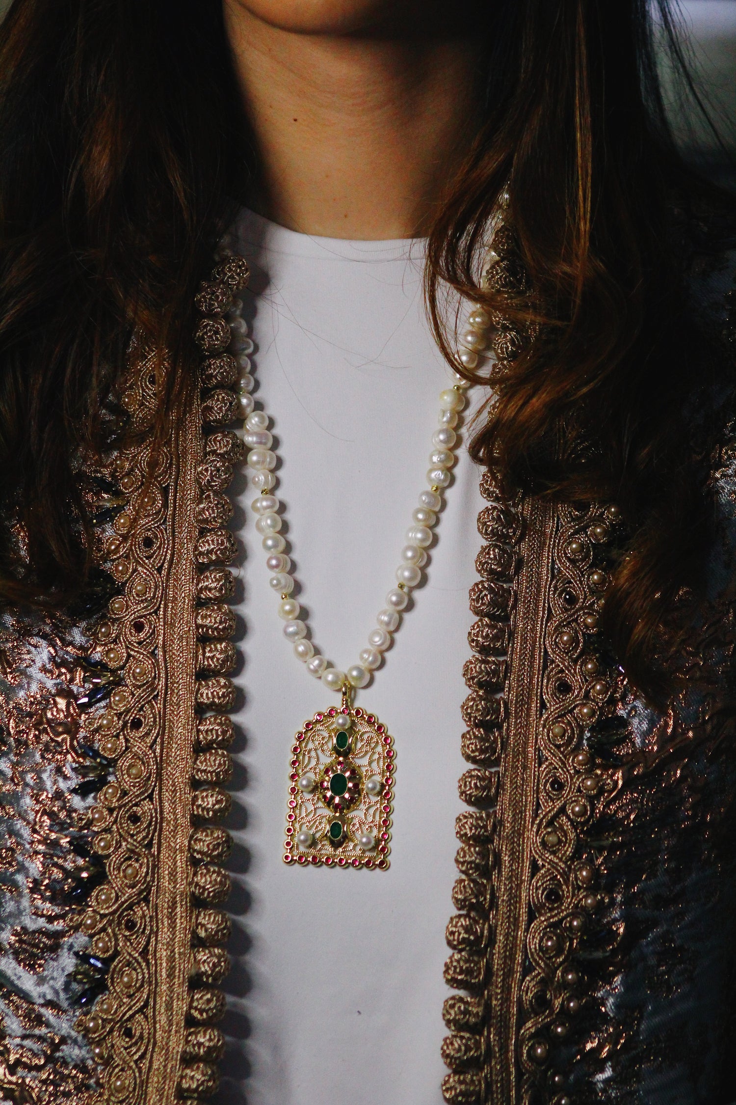 A striking display of Moroccan heritage, the Manal Necklace is handcrafted with gold-plated details, real pearls, and gemstone accents. An heirloom-inspired piece designed for bold sophistication.